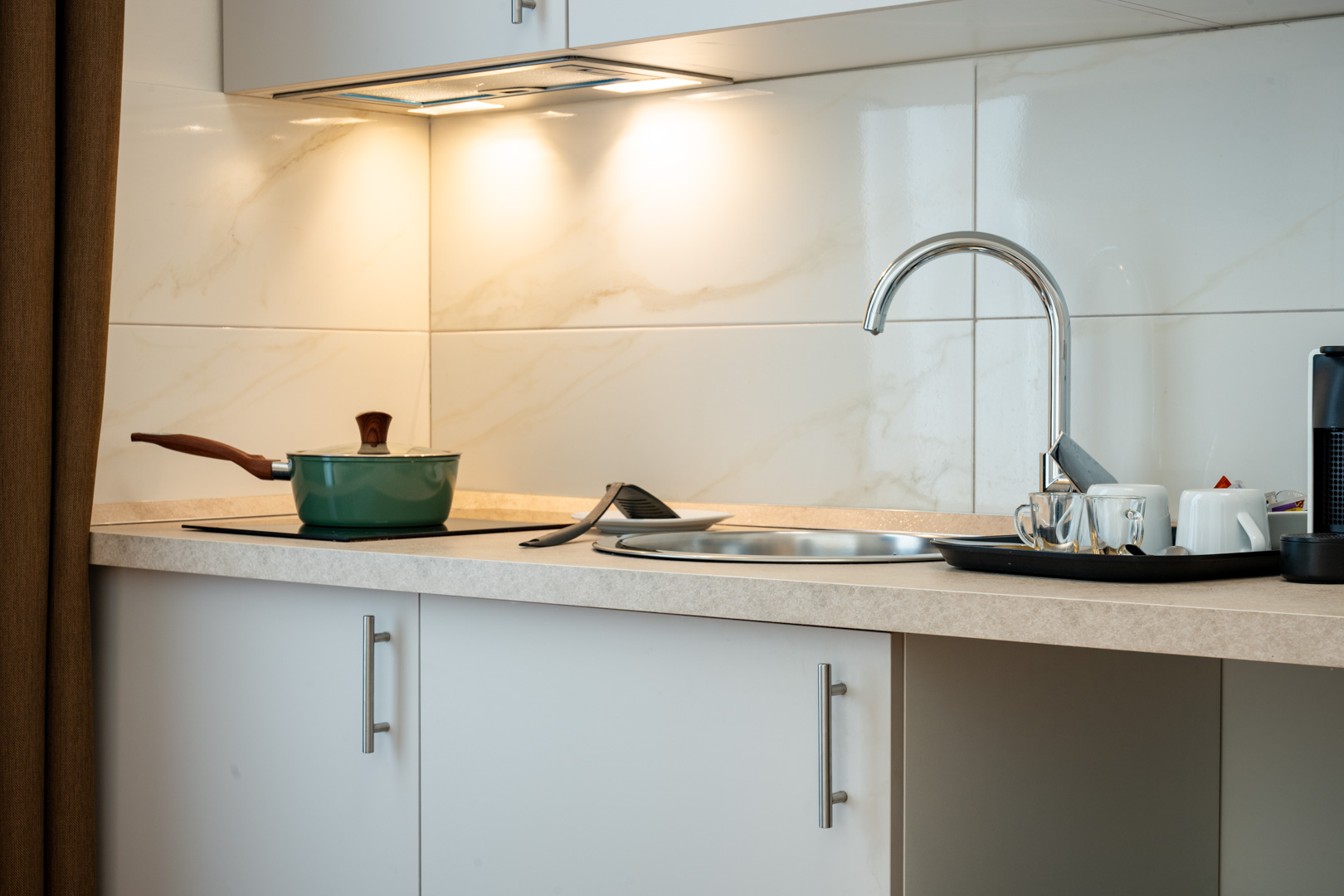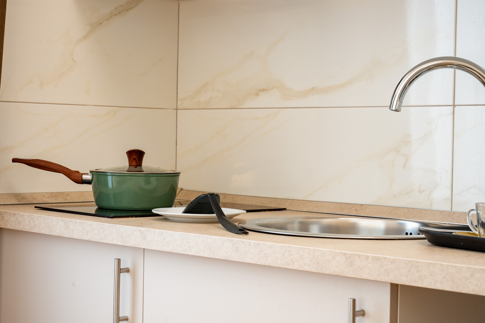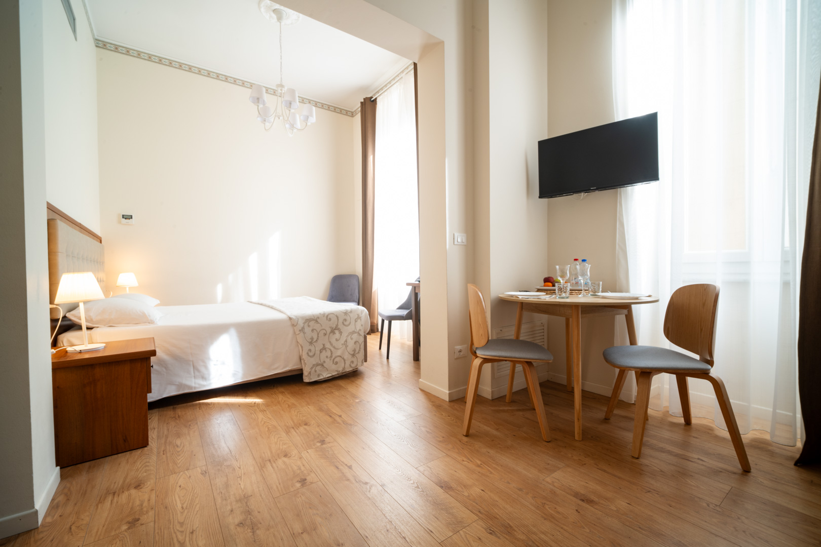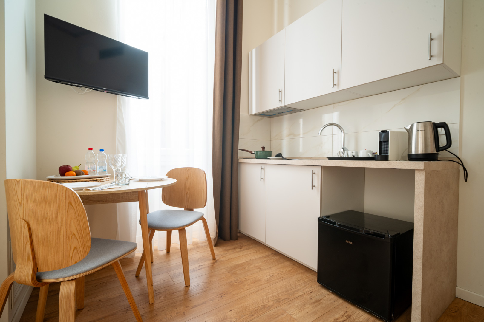 This spacious, classic-style room consists of two rooms and is furnished with a large bed and a sofa bed. There is also a small sitting area, dining table, coffee machine, a kitchenette with stove and sink. The windows overlook the courtyard, so the room is suitable for guests who want to relax without excessive noise from the street. The Studio apartment can accommodate up to 3 people and, upon request, a cot can also be added at an additional cost. The room size is 26 m². THE ROOMS HAVE BEEN RENOVATED IN 2024!
